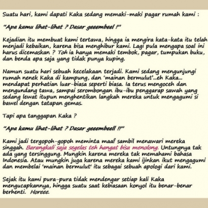 Kata sindiran buat pemerintah desa. Bukan pula dengan maksud memuji atau menghina saya berani mengatakan bahwa seorang Dayak atau irian-pun jika berada dalam keadaan sama akan sanggup belajar sampai mencapai apa yang bisa dicapai suku bangsanya yang berada di desa dan di kota. Jangan giliran banjir selalu menyalahkan pemerintah. Puji dan syukur penulis panjatkan kehadirat Allah SWT.